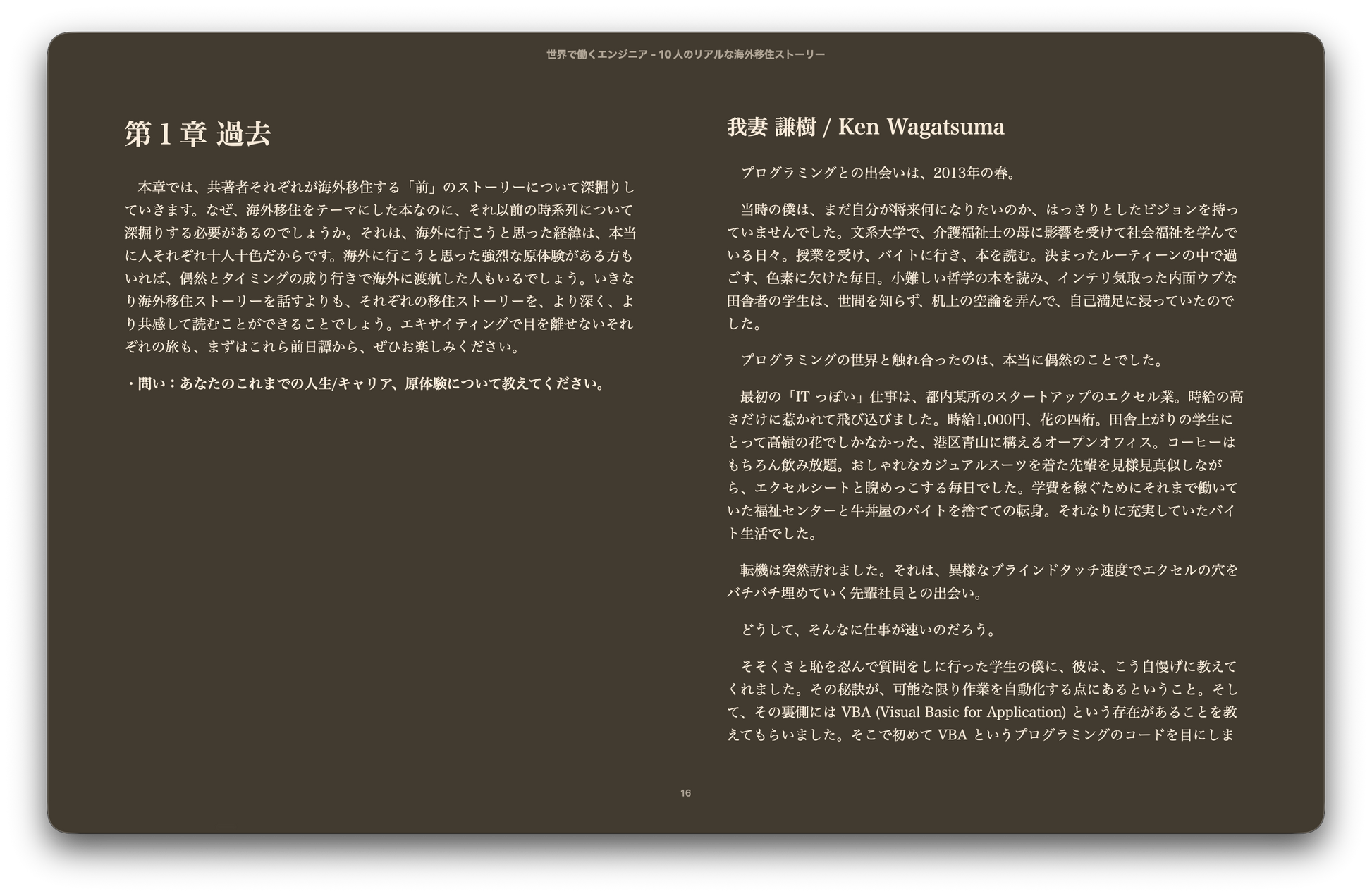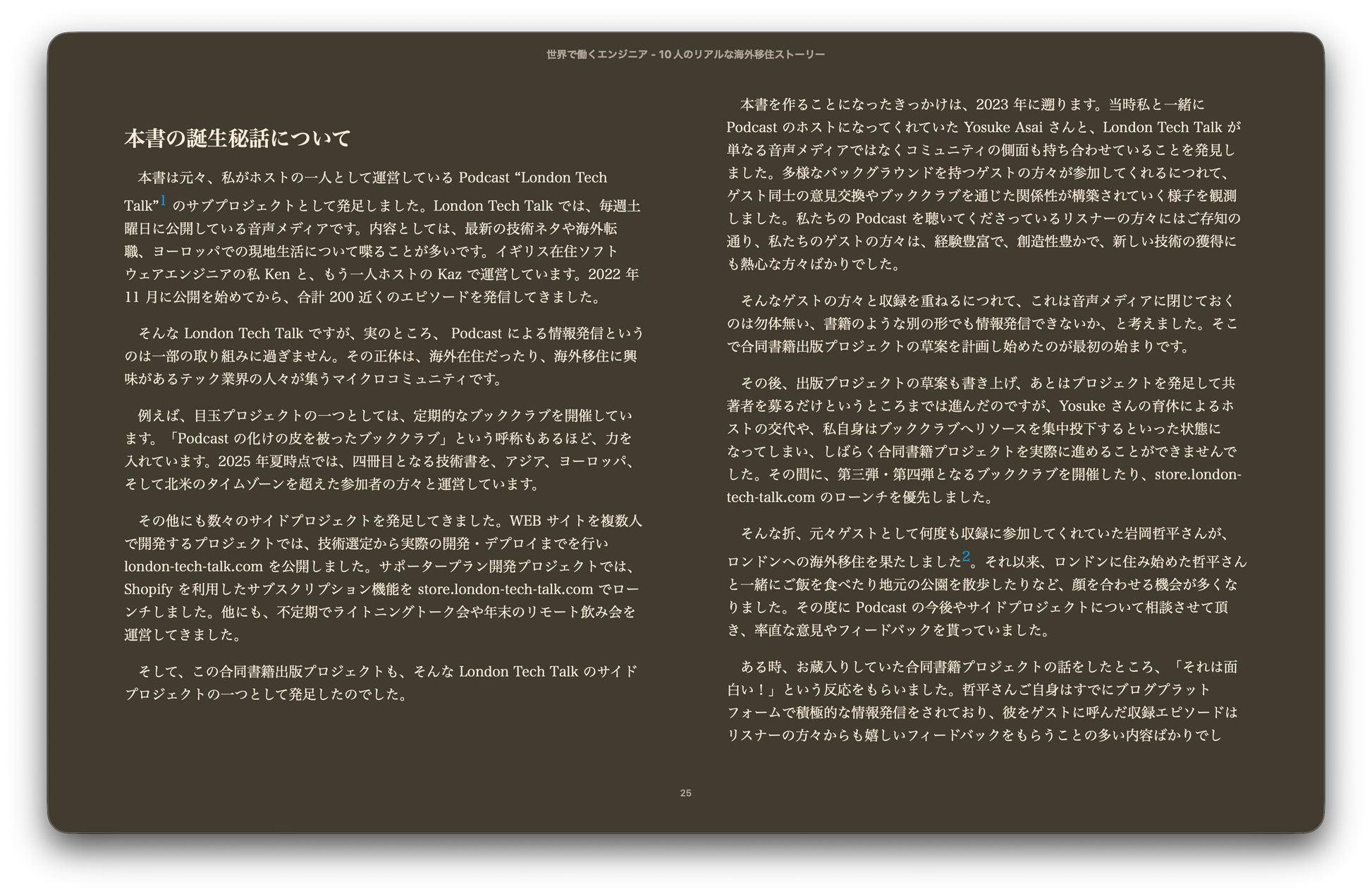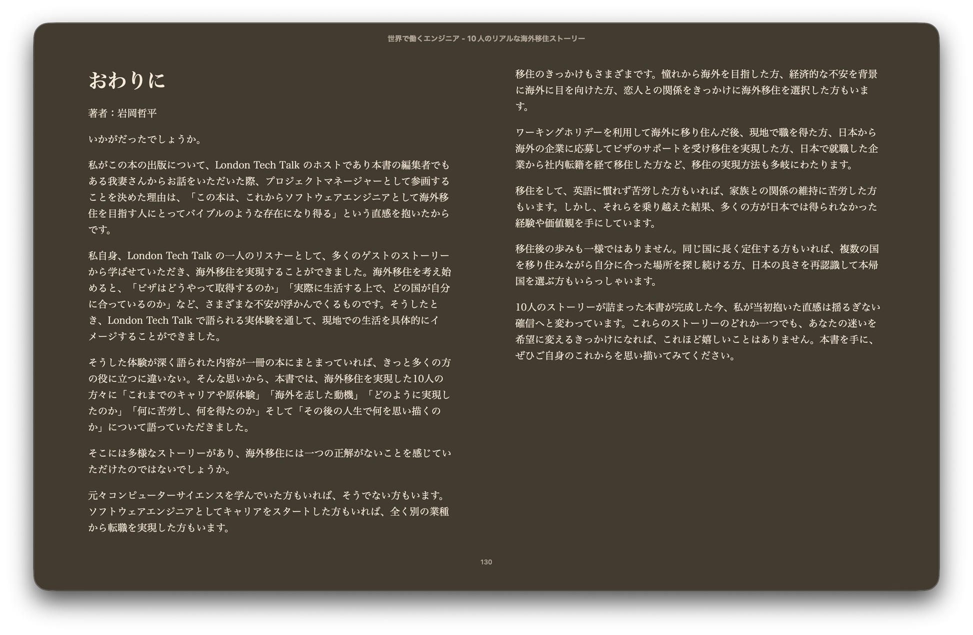 本書では、Podcast "London Tech Talk" に登場した10人のエンジニアの海外移住ストーリーを、【過去】【意志】【手段】【挑戦】【未来】という5つの共通軸で紹介します。